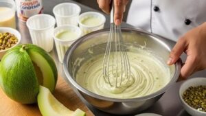 खरबूजे की प्यूरी तैयार करें: खरबूजे को छीलकर उसके बीज निकाल लें, और उसे छोटे-छोटे क्यूब्स में काट लें। इन क्यूब्स को मिक्सर में ब्लेंड करके स्मूद प्यूरी बना लें। ध्यान रखें कि पानी न डालें।