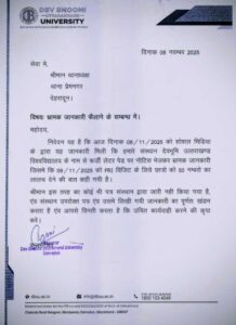 देहरादून: सोशल मीडिया के माध्यम से देवभूमि उत्तराखण्ड विश्वविद्यालय के नाम से एक फर्जी लेटर पैड पर जारी नोटिस वायरल होने का मामला सामने आया है। इस पत्र में छात्रों को 9 नवम्बर 2025 को FRI देहरादून भ्रमण के लिए 50 अंकों का लाभ देने की बात कही गई है।