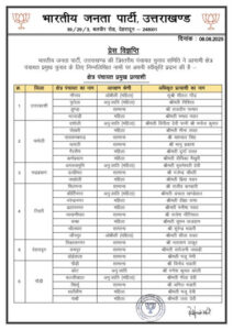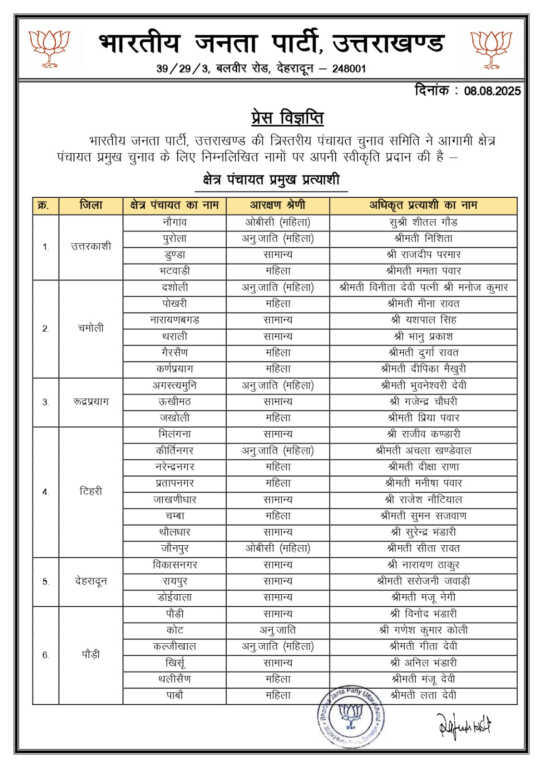 उत्तराखंड में पंचायत प्रमुखों के लिए भाजपा ने जारी की प्रत्याशियों की सूची……..
