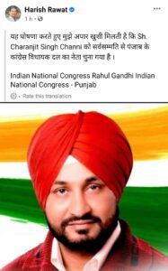 दो दिन से पंजाब में चल रहे सियासी उठापटक के बाद कांग्रेस के दलित चेहरा चरणजीत सिंह चन्नी को पंजाब कांग्रेस का विधायक दल का नेता चुन लिया है और अब वह पंजाब के नए मुख्यमंत्री होंगे, यह जानकारी उत्तराखंड पंजाब कांग्रेस के प्रभारी हरीश रावत ने अपने ट्वीट के जरिए दी है।