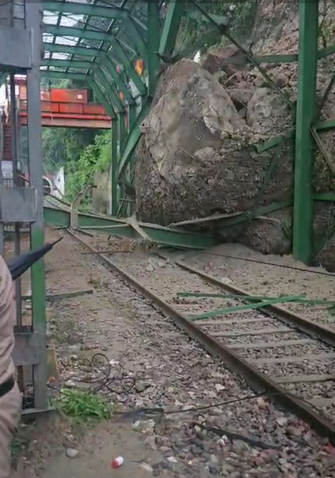 हरिद्वार: हरिद्वार में कल से हो रही बारिश ने अपना कहर बरपा रखा है, जहा शहर के कई हिस्सों में जल भराव हो गया है, वहीं अभी – अभी भीमगोड़ा में काली मंदिर के पास मनसा देवी पहाड़ का एक बड़ा हिस्सा टूट कर रेलवे ट्रैक पर गिर गया है।