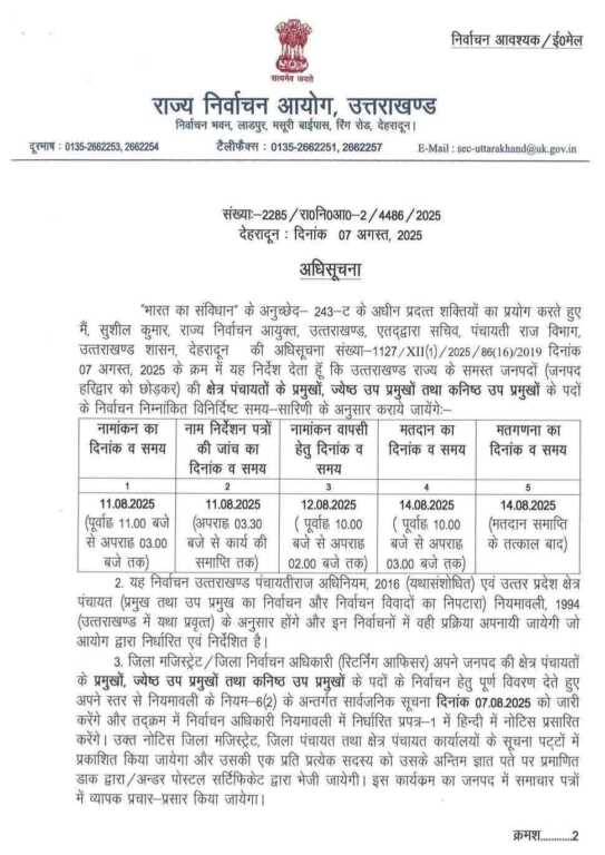 भारत का संविधान के अनुच्छेद 243-ट में प्रदत्त शक्तियों का प्रयोग करते हुए मैं, सुशील कुमार, राज्य निर्वाचन आयुक्त, उत्तराखण्ड, एतद्वारा सचिव, पंचायती राज विभाग, उत्तराखण्ड शासन, देहरादून की अधिसूचना संख्या-1126/XII (1)/2025/86(16)/2019 दिनांक 07 अगस्त, 2025 के क्रम में यह निर्देश देता हूँ कि उत्तराखण्ड राज्य के समस्त जनपदों (जनपद हरिद्वार को छोड़कर) के जिला पंचायत के अध्यक्ष एवं उपाध्यक्ष का निर्वाचन निम्नांकित विनिर्दिष्ट समय सारिणी के अनुसार सम्पन्न कराया जायेगा। इस निर्वाचन हेतु निर्वाचन प्रक्रिया जिला पंचायत मुख्यालय पर सम्पन्न होगी:-
