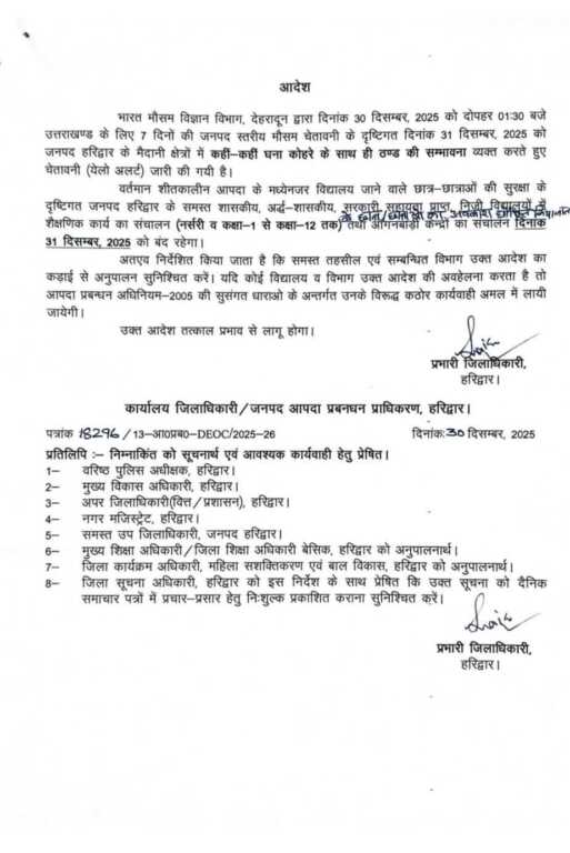 वर्तमान शीतकालीन आपदा के मध्येनजर विद्यालय जाने वाले छात्र-छात्राओं की सुरक्षा के दृष्टिगत जनपद हरिद्वार के समस्त शासकीय, अर्द्ध-शासकीय, सरकारी सहायता प्राप्त निमीर विधालयों ऊँचालान शैक्षणिक कार्य का संचालन (नर्सरी व कक्षा-1 से कक्षा-12 तक) तथा आगनबाड़ी केन्द्रों के छात्र/छाता आंगनबाड़ी केन्द्रों का संचालन दिनांक 31 दिसम्बर, 2025 को बंद रहेगा।