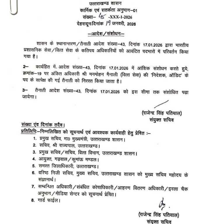 देहरादून: निदेशक ऑडिट के पद से मनमोहन मैनाली को हटाया गया, बड़ी खबर, आईएएस की जगह दी गई थी तैनाती, हुआ था विरोध, पोस्टिंग होते ही मैनाली पर उठने लगे थे सवाल, अब कार्मिक विभाग ने जारी किया ये आदेश।