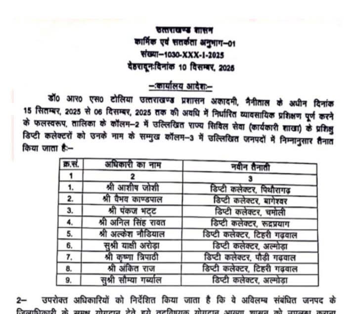 देहरादून: डॉ० आर० एस० टोलिया उत्तराखण्ड प्रशासन अकादमी, नैनीताल के अधीन दिनांक 15 सितम्बर, 2025 से 06 दिसम्बर, 2025 तक की अवधि में निर्धारित व्यावसायिक प्रशिक्षण पूर्ण करने के फलस्वरूप, तालिका के कॉलम-2 में उल्लिखित राज्य सिविल सेवा (कार्यकारी शाखा) के प्रशिक्षु डिप्टी कलेक्टरों को उनके नाम के सम्मुख कॉलम-3 में उल्लिखित जनपदों में निम्नानुसार तैनात किया जाता है।