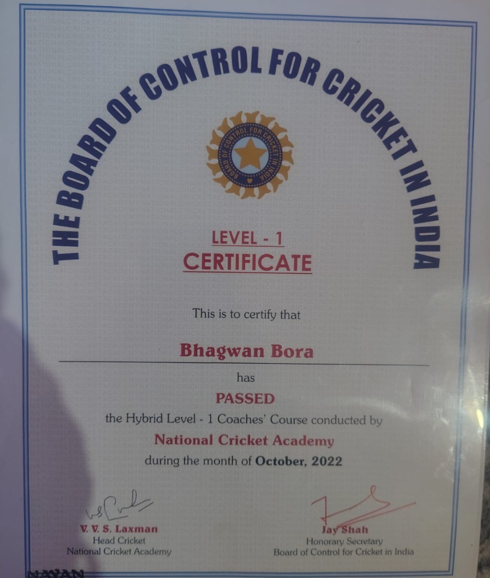भगवान बोरा ने बताया कि बीसीसीआई लेवल वन क्रिकेट कोच परीक्षा हेतु 5 लोगों के नाम उत्तराखंड क्रिकेट एसोसिएशन द्वारा बेंगलुरु एनसीए को भेजे गए थे। जहां पर उन्होंने क्रिकेट कोच हेतु प्रशिक्षण प्राप्त कर परीक्षा में प्रतिभाग किया था। इसके बाद अब बीसीसीआई लेवल वन क्रिकेट कोच का प्रमाण पत्र बीसीसीआई द्वारा उन्हें प्राप्त हुआ है।