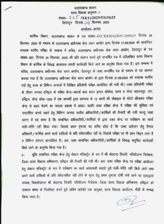 कार्मिक विभाग, उत्तराखण्ड शासन के पत्र संख्या-452/XXX (4)2025-2(09)25 दिनांक 24 सितम्बर, 2025 के माध्यम से उत्तराखण्ड अधीनस्थ सेवा चयन आयोग द्वारा दिनांक 21.09.2025 को आयोजित स्नातक स्तरीय परीक्षा के सम्बन्ध में सचिव, उत्तराखण्ड अधीनस्थ सेवा चयन आयोग, देहरादून के पत्र संख्या-357, दिनांक 24 सितम्बर, 2025 की प्रति संलग्न करते हुये सन्दर्भित पत्र में उल्लिखित ग्राम्य विकास विभाग के कार्मिक के विरूद्ध आवश्यक प्रभावी कार्यवाही किये जाने का अनुरोध किया गया है।