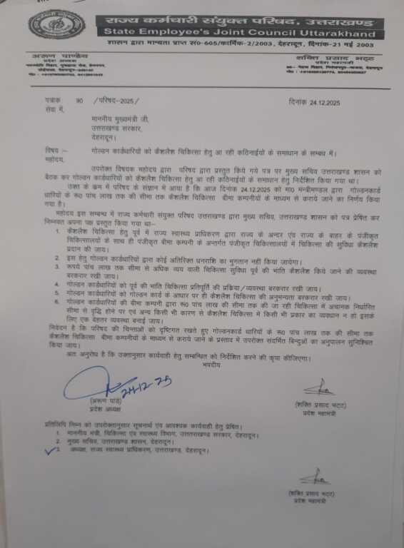 देहरादून: राज्य कर्मचारी संयुक्त परिषद उत्तराखण्ड के प्रदेश अध्यक्ष अरूण पांडे ने प्रेस विज्ञप्ति जारी कर बताया कि आज मंत्रीमण्डल द्वारा गोल्डन कार्डधारियों को कैश लैश चिकित्सा व्यवस्था हाईब्रिड मोड में करते हुए रू0 पांच लाख की सीमा तक इन्योरेंन्स कम्पनी द्वारा एंव उससे अधिक व्यय वाले ईलाज पूर्व की भांति राज्य स्वास्थ्य प्राधिकरण द्वारा किये जाने का निर्णय किया गया है।