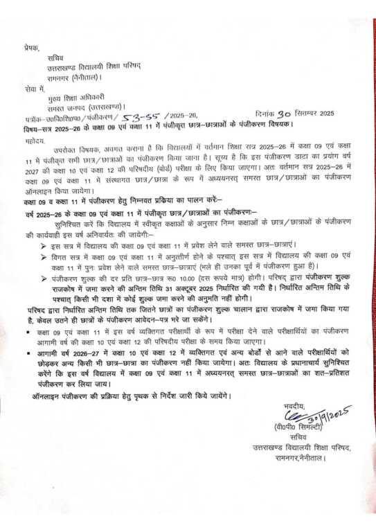 देहरादून: विषय-सत्र 2025-26 के कक्षा 09 एवं कक्षा 11 में पंजीकृत छात्र-छात्राओं के पंजीकरण के आदेश