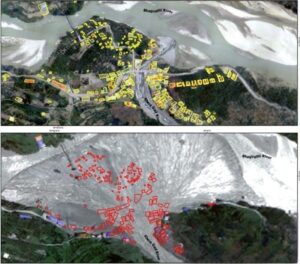 एक सेटेलाइट चित्र में आपदा के बाद पसरे मलबे की स्थिति भी बताई गई है। स्पष्ट किया गया है कि जलप्रलय के साथ आया मलबा धराली क्षेत्र में चौड़ाई में 750 मीटर, जबकि लंबाई में (खीर गंगा के बहाव वाली दिशा में) 450 मीटर पर पसरा है।